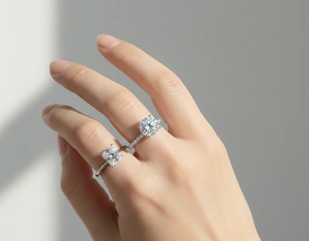 Quy tắc là "không chọn bản nhẫn quá dày". Khi chọn viên chủ nhẫn cưới, hãy ưu tiên giác cắt Tròn (Round Brilliant) hoặc Princess (Vuông). Bản nhẫn mỏng khoảng 1.8mm sẽ giúp tạo khoảng trống da thịt, khiến ngón tay trông dài hơn thực tế.