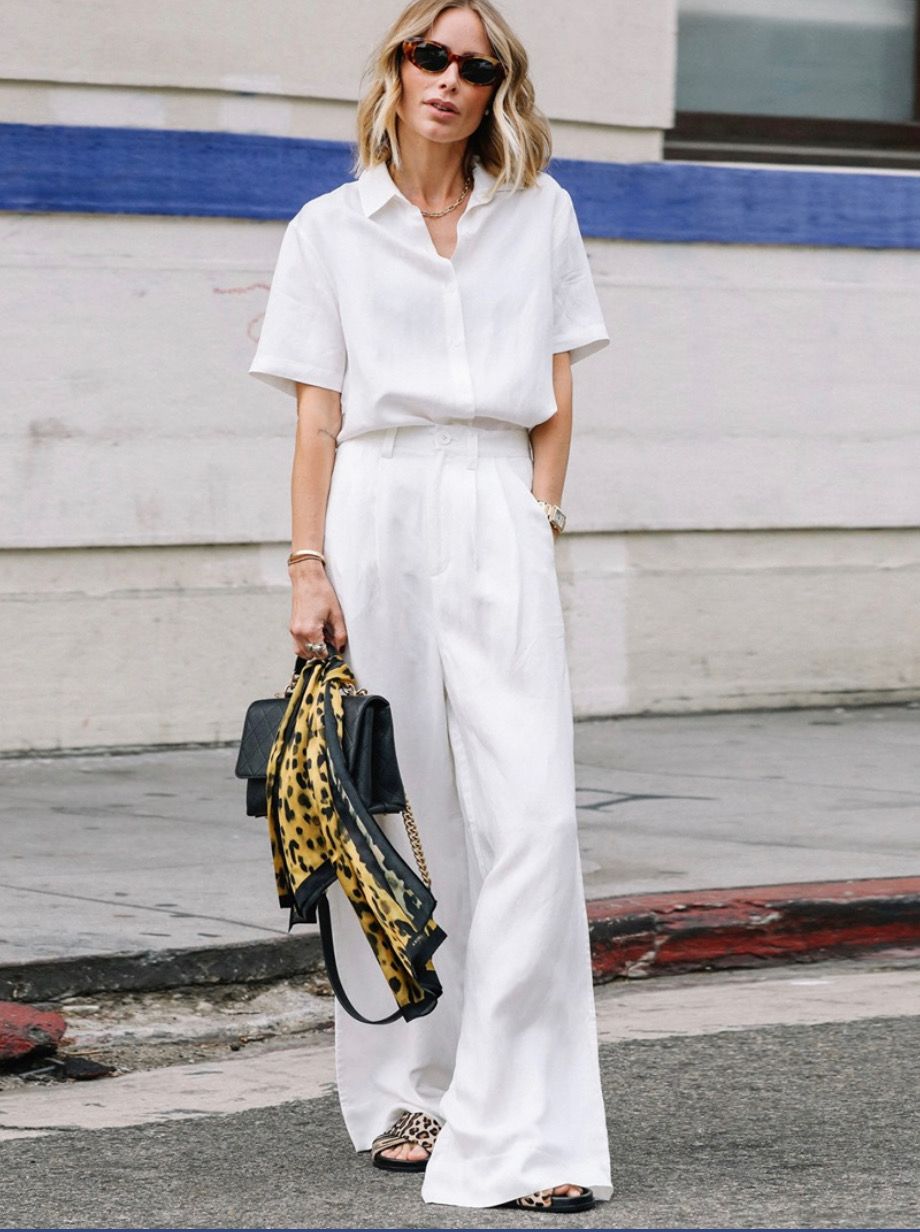 Để có một bộ trang phục công sở trang trọng, áo sơ mi trắng là một lựa chọn không thể thiếu. Một chiếc áo sơ mi cổ điển, được sơ vin gọn gàng với quần ống rộng, kết hợp cùng phụ kiện thắt lưng và một đôi giày cao gót mũi nhọn để có một dáng đứng cao ráo và thanh thoát hơn. Đừng quên phụ kiện thắt lưng để tạo điểm nhấn cho trang phục. Đối với áo sơ mi trắng, quần tây ống rộng màu trắng, đen hoặc màu trung tính là sự lựa chọn tối ưu, những gam màu này nhã nhặn vừa đủ để khiến tổng thể trông sang trọng và quý phái.