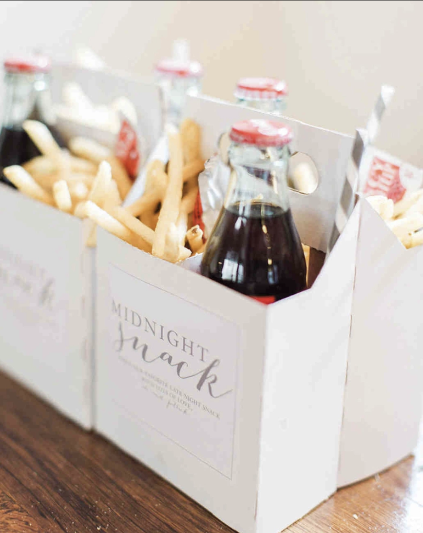 Sau một buổi tiệc rượu vui vẻ, một phần đồ ăn vặt có thể mang đi sẽ là "cứu tinh" cho khách mời. Một chai nước ngọt có ga, khoai tây chiên giòn rụm và bánh mì kẹp thịt nhỏ xinh sẽ là bữa khuya hoàn hảo, thể hiện sự chu đáo và tinh tế của cô dâu chú rể.