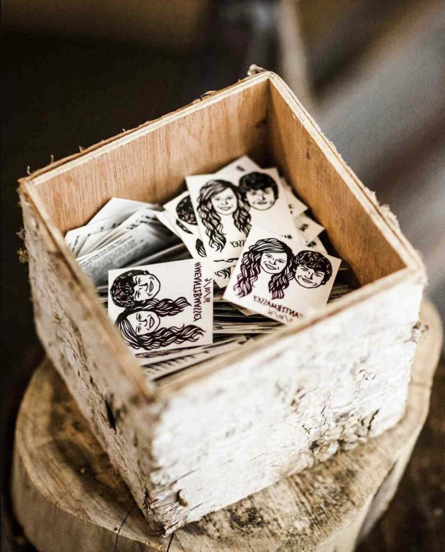 Hình xăm tạm thời với tranh vẽ minh họa hai vợ chồng bạn là một ý tưởng cực kỳ sáng tạo và vui nhộn. Các khách mời có thể sử dụng hình xăm ngay tại đám cưới và chụp ảnh lưu niệm với uyên ương tại khu photobooth, tạo ra những khoảnh khắc đáng nhớ và hài hước.