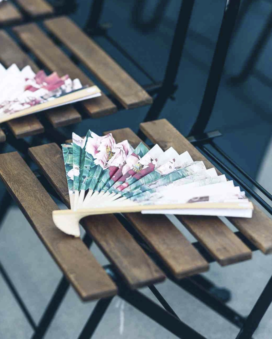 Với những đám cưới được tổ chức ngoài trời, đặc biệt là ở bờ biển hoặc trong tiết trời nóng nực, quạt giấy sẽ là món quà vô cùng hữu dụng. Không chỉ giúp khách mời xua tan cái nóng, những chiếc quạt được thiết kế đẹp mắt còn có thể được sử dụng làm đạo cụ để chụp hình tại khu photobooth, tăng thêm sự thú vị cho buổi tiệc.
