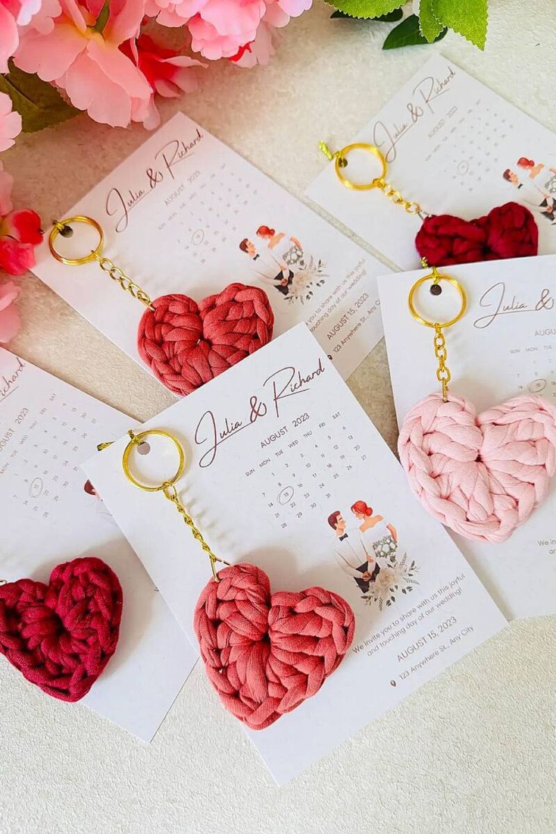 Móc khóa là vật dụng nhỏ gọn, thiết thực mà ai cũng sử dụng hàng ngày. Bạn có thể đặt làm móc khóa bằng kim loại, gỗ, hoặc mica, len,.. có khắc tên hai vợ chồng, ngày cưới hoặc một biểu tượng đặc trưng của hai bạn (ví dụ: hình trái tim, hình ngôi nhà, hoặc hình ảnh chibi của cô dâu chú rể). Đây là món quà bền bỉ, giúp khách mời luôn mang theo một phần kỷ niệm đẹp về ngày vui của bạn.