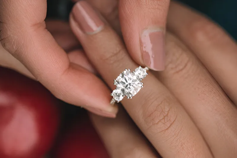 - Sử dụng hiệu ứng "Đá tấm lừa thị giác": Thay vì dùng 3 viên kim cương thiên nhiên lớn, bạn có thể chọn một viên chủ lớn ở giữa và hai viên phụ là kim cương Lab-grown hoặc đá Moissanite cao cấp. Ánh sáng của chúng sẽ hòa quyện vào nhau khiến người nhìn khó lòng phân biệt.