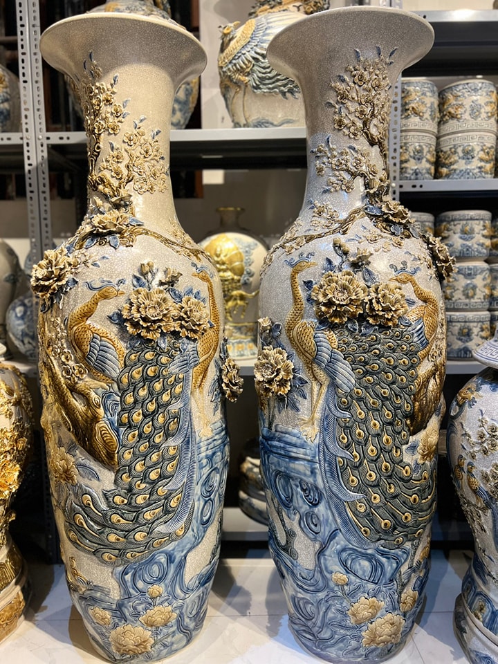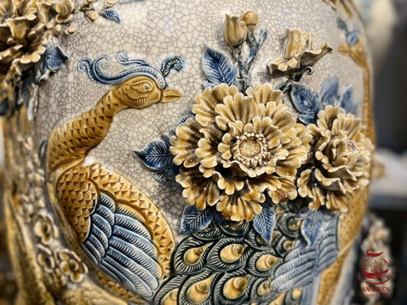 Lộc bình men rạn đắp nổi họa tiết chim công